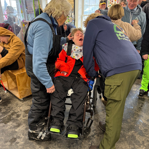 We then started preparing for Colin's return to the slopes. Colin would be the first one to ride in the new sled and he would be driven by Lou with Meg and Tom as the guides and all the other people there to ski with us would be part of his inaugural run. It take s a bit of time to get Colin transferred, and buckled and mittens on and a helmet and goggles- basically all the things that Colin is not a fan of and never seem to fit just right! Just like that first day- Lou made sure everything was just right- and then they were off- for that damn chairlift again. It terrified me on day one when they loaded Colin up and it scared me again as Colin loaded and eventually went out of site.
